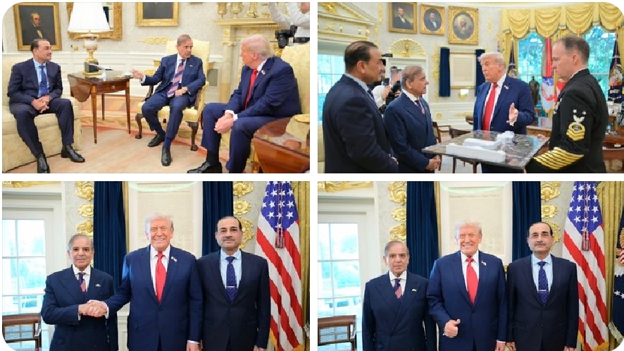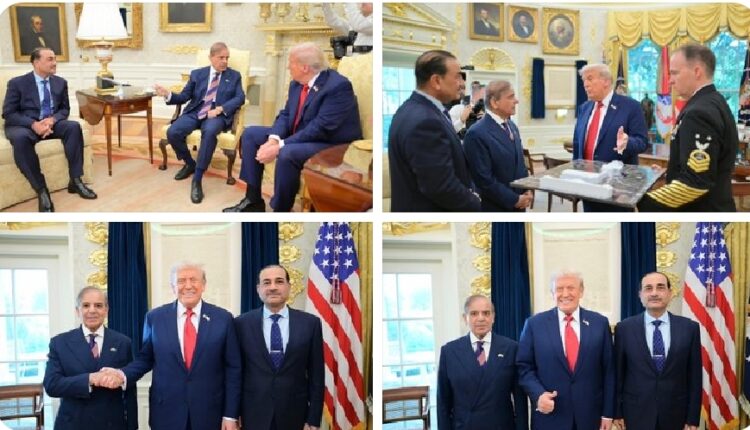 وزیراعظم محمد شہباز شریف نے وائٹ ہاؤس میں امریکی صدر ڈونلڈ جے ٹرمپ سے ملاقات کی۔ اس موقع پر چیف آف آرمی اسٹاف فیلڈ مارشل سید عاصم منیر بھی ان کے ہمراہ تھے۔