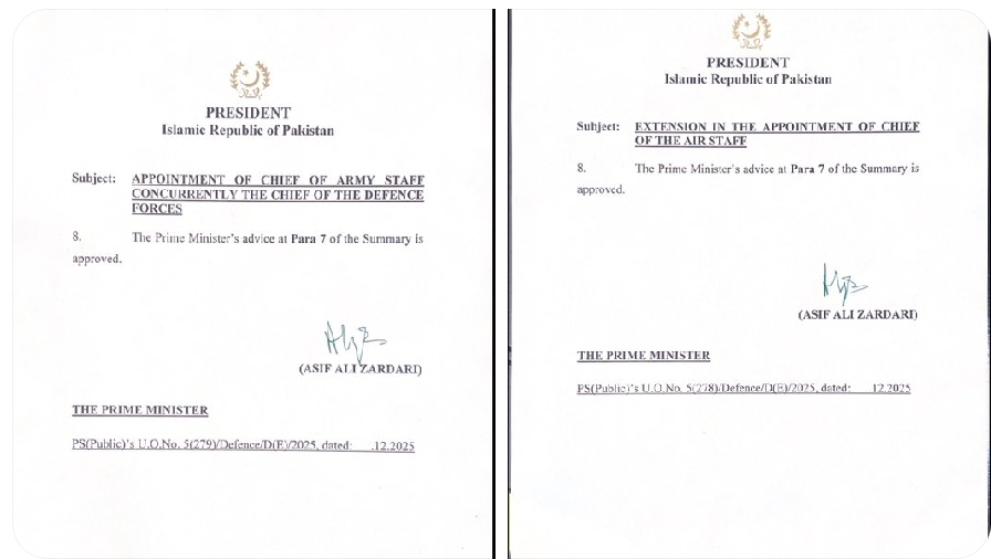 اسلام آباد: صدرآصف علی زرداری نے وزیراعظم کی سمری پر فیلڈ مارشل سید عاصم منیر کی پانچ سال کے لیے بطور چیف آف آرمی اسٹاف اور چیف آف ڈیفنس فورسز تقرری کی منظوری دے دی ہے۔