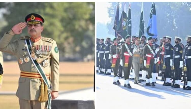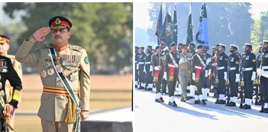 چیف آف آرمی اسٹاف و چیف آف ڈیفنس فورسز فیلڈ مارشل سید عاصم منیر کو جنرل ہیڈ کوارٹرز (جی ایچ کیو) میں تینوں سروسز کے دستوں نے گارڈ آف آنر پیش کیا۔