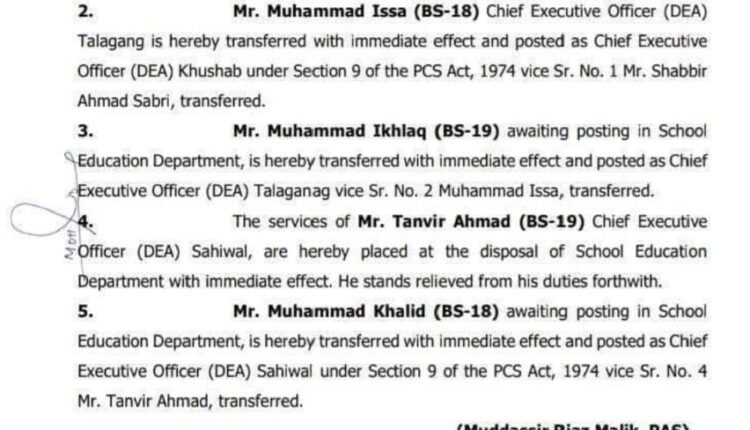 سی ای او ایجوکیشن تلہ گنگ کا تبادلہ، محمد اخلاق نئے چیف ایگزیکٹو مقرر