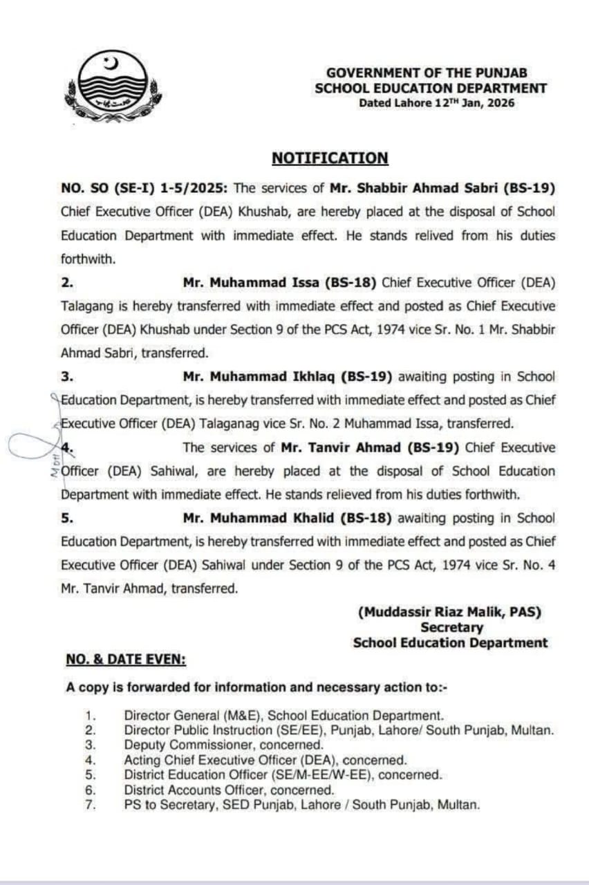 جاری کردہ نوٹیفکیشن کے مطابق محمد اخلاق کو نیا چیف ایگزیکٹو آفیسر ایجوکیشن اتھارٹی ضلع تلہ گنگ تعینات کر دیا گیا ہے۔