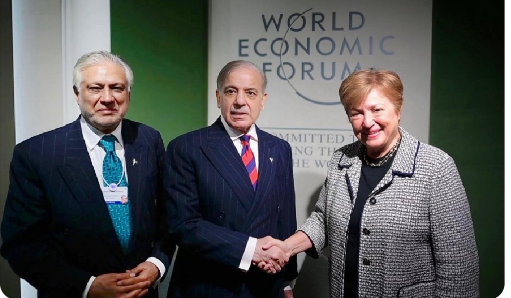 وزیراعظم محمد شہباز شریف نے ورلڈ اکنامک فورم کے 56ویں سالانہ اجلاس کے موقع پر ڈیووس میں انٹرنیشنل مانیٹری فنڈ (آئی ایم ایف) کی منیجنگ ڈائریکٹر کرسٹالینا جارجیوا سے ملاقات کی، جس میں پاکستان کی معیشت میں استحکام اور اصلاحات سے متعلق امور پر تبادلۂ خیال کیا گیا۔