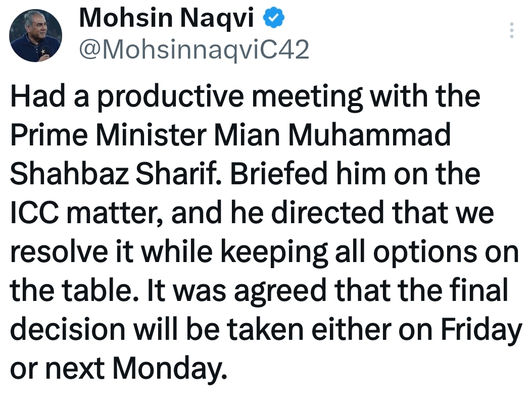 محسن نقوی نے سوشل میڈیا پلیٹ فارم ایکس پر اپنے بیان میں کہا کہ پاکستان کے ٹی ٹوئنٹی ورلڈ کپ میں شرکت سے متعلق حتمی فیصلہ جمعہ یا اگلے پیر کو کیا جائے گا۔