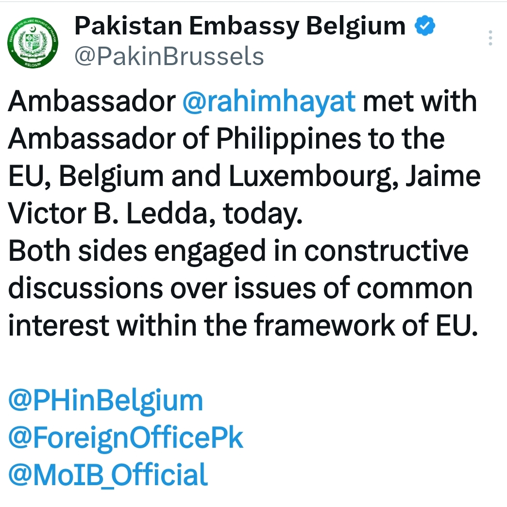 ملاقات کے دوران دونوں سفیروں نے یورپی یونین کے پلیٹ فارم پر پاکستان اور فلپائن کے درمیان اشتراکِ عمل کو مزید مضبوط بنانے کے امکانات کا جائزہ لیا۔